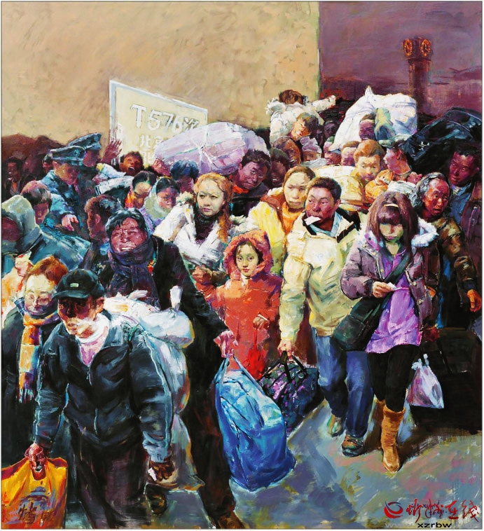 《春潮——回家過年》這幅作品是典型、真實(shí)的社會(huì)現(xiàn)實(shí)和人性本真的寫照,這個(gè)瞬間定格了一段讓多少人刻骨銘心的記憶,敘述了周期性的人類大遷徙——春運(yùn)。該畫所蘊(yùn)涵的是中國(guó)人心中那份最飽滿的希望。旅客是彼此都不認(rèn)識(shí)的陌生人,為了一個(gè)回家的目的,毫無距離地?cái)D在一起,人物個(gè)性鮮明。畫家具有強(qiáng)大的創(chuàng)作能力和藝術(shù)表現(xiàn)力。(邢晨聲 文)
