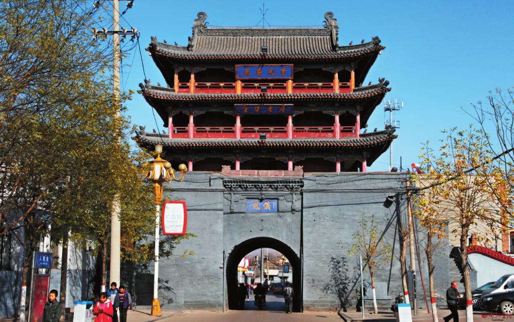 地處府城中心的鼓樓,是府城的最高建筑。明成化年間(1465年——1487年)建成,清光緒十七年(1891年)重修。鼓樓通高20米,磚石結(jié)構(gòu)臺基,上有三層建筑。鼓樓的奇特之處是底層磚碹洞是十字洞,東西南北四面皆通。東西兩個洞使七百戶街保持直通,成為寧武府城最長最寬的街。南北兩洞延伸,將頭百戶、三百戶、五百戶、九百戶幾條街連成一片,既便于排水,又方便出行。西門刻“鳳儀”,東門刻“含陽”,下題“光緒辛卯圜郡重建”。磚洞以上是三層木結(jié)構(gòu)建筑,面寬五間,進(jìn)深四椽,四周圍廊,檐柱間設(shè)雀替。三重檐歇山頂,一重檐下東西設(shè)隔扇門,其余為墻體。二、三重檐下東西面懸匾,東為“樓煩重鎮(zhèn)”“毓秀鐘靈”,西為“奎光普照”“層霄聳翠”。鼓樓為省級文物保護(hù)單位。