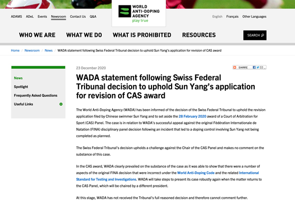 在得知瑞士最高法院撤銷對孫楊的裁決后,WADA對此事發(fā)表聲明稱,已得知瑞士聯(lián)邦最高法院支持孫楊對CAS判決的改判請求,會積極采取行動,在案件回到國際體育仲裁法庭后,繼續(xù)陳述其立場。聲明如下: 世界反興奮劑機構(WADA)已獲悉,瑞士聯(lián)邦最高法庭決定支持中國游泳運動員孫揚的改判申請并撤銷國際體育仲裁法庭(CAS)對其作出的禁賽裁決。 瑞士聯(lián)邦法庭的裁決對CAS小組主席提出了質(zhì)疑,對本案的實質(zhì)內(nèi)容不作任何評論。 在CAS裁決中,WADA顯然占了上風,能夠證明國際泳聯(lián)(FINA)最初裁決的許多方面在《世界反興奮劑條例》及相關的《國際檢測與調(diào)查標準》下均不正確,在案件回到CAS由其他主席主持的仲裁小組時,WADA將繼續(xù)陳述其立場。 目前,WADA尚未收到法庭完整的裁決,因此無法進一步發(fā)表評論。 (責任編輯:蔡文斌) |