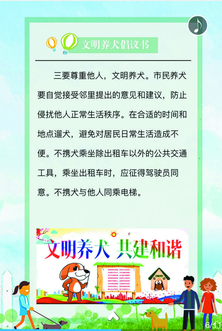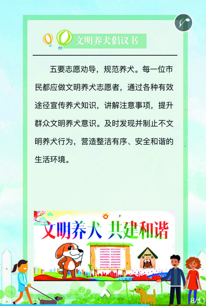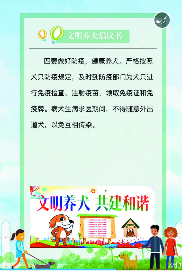 在宣傳活動中,民警深入街道、小區(qū)、商鋪等人員密集場所,在宣傳欄懸掛文明養(yǎng)犬宣傳標語、張貼文明養(yǎng)犬倡議書等宣傳資料,向轄區(qū)居民詳細講解《忻州市養(yǎng)犬管理條例》《文明養(yǎng)犬公告》的具體內容,引導養(yǎng)犬群眾主動辦理養(yǎng)犬登記證、出門為犬只佩戴犬牌、定期為犬只注射疫苗,做到依法養(yǎng)犬、文明養(yǎng)犬、衛(wèi)生養(yǎng)犬、健康養(yǎng)犬、安全養(yǎng)犬。活動中,該局共懸掛宣傳標語50條,張貼文明養(yǎng)犬倡議書500份,向群眾發(fā)放宣傳資料3500人/份。
