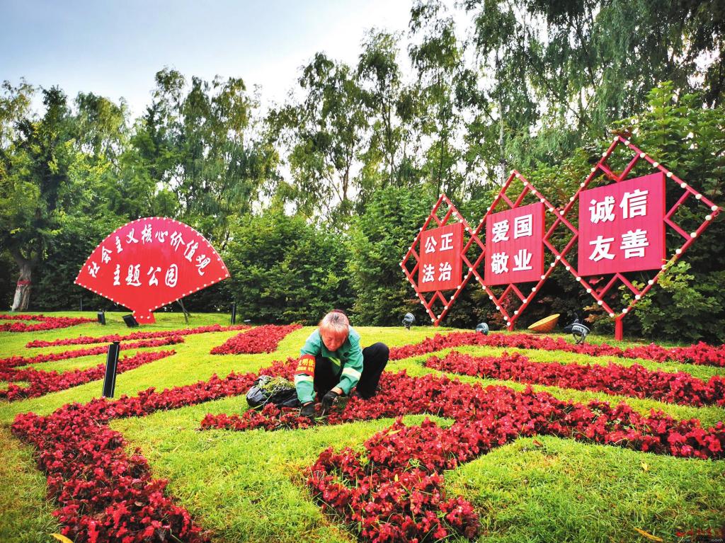 | 園林管護(hù)人員為人民公園的綠化帶內(nèi)清雜草 |