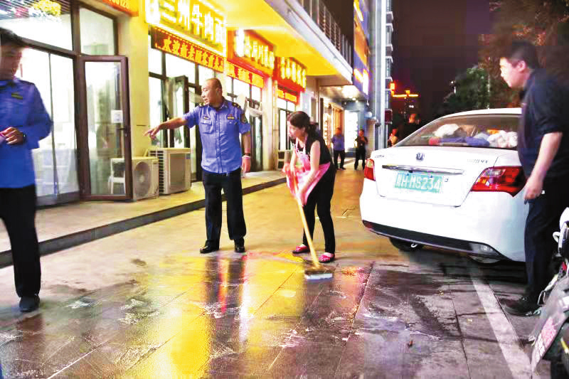 據(jù)了解,此次行動共出動執(zhí)法人員近30名。通過專項整治,進一步規(guī)范了城區(qū)商鋪的經(jīng)營秩序,提升了居民的環(huán)保意識和文明意識,營造了和諧文明的市容環(huán)境。圖為執(zhí)法人員與商家一同清理店鋪門前油污。(記者張志遠(yuǎn) 攝影報道)