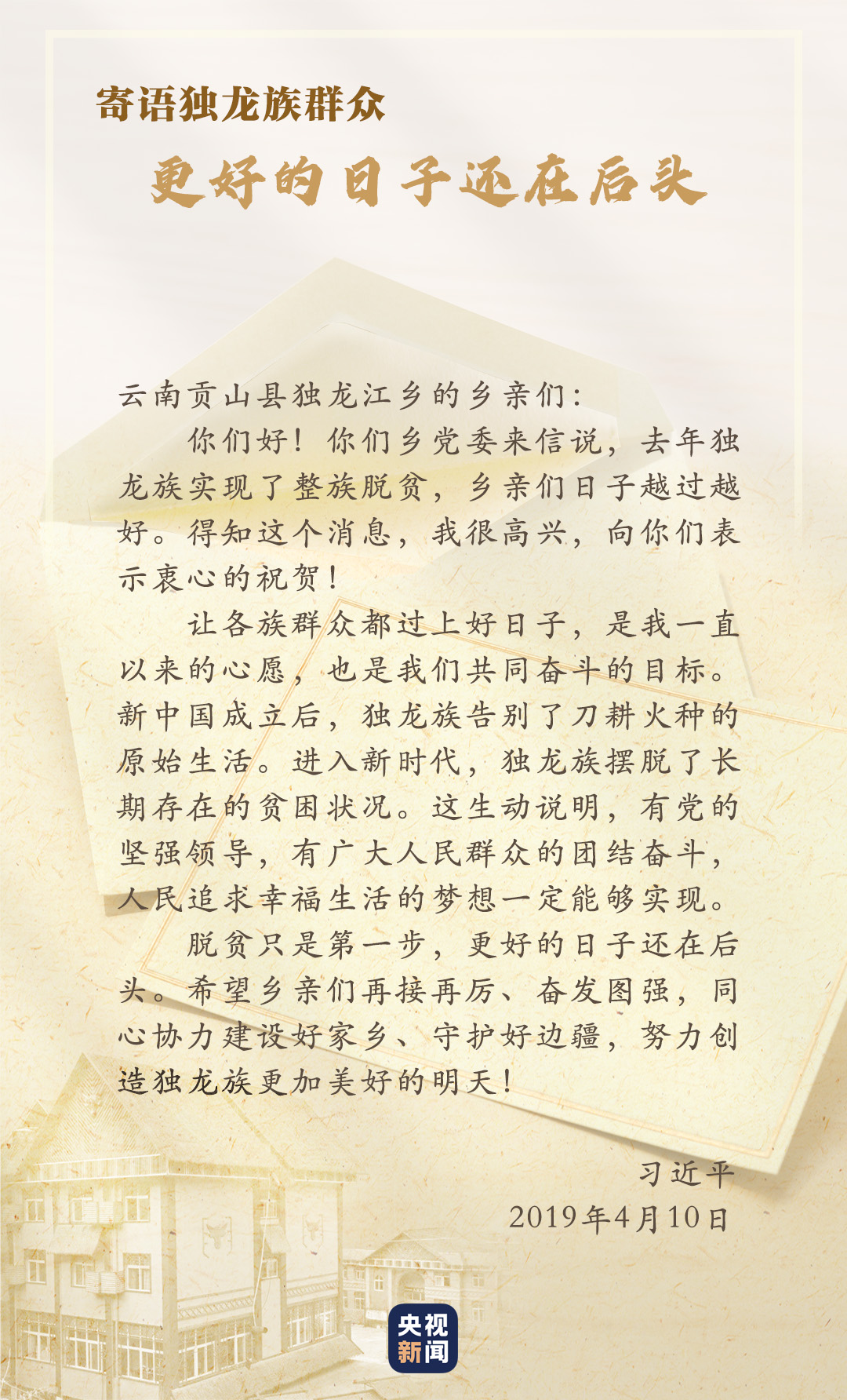 2018年,獨(dú)龍江鄉(xiāng)6個(gè)行政村整體脫貧,獨(dú)龍族實(shí)現(xiàn)整族脫貧,基礎(chǔ)設(shè)施、特色產(chǎn)業(yè)、社會事業(yè)等都發(fā)生了巨大變化。貢山縣干部群眾再次給習(xí)近平寫信匯報(bào)脫貧成績,習(xí)近平得知后非常高興,向他們表示“衷心的祝賀”,并勉勵鄉(xiāng)親們?yōu)檫^上更加幸福美好的生活繼續(xù)團(tuán)結(jié)奮斗。