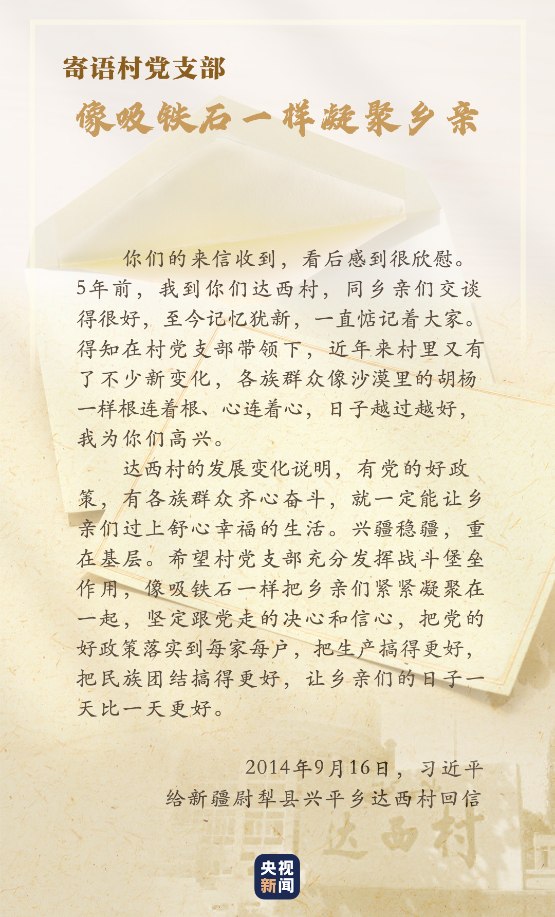 “口袋里要鼓囊囊,精神上要亮堂堂”。2014年4月,習(xí)近平在新疆考察時(shí)講到了達(dá)西村的村訓(xùn)。村民們懷著激動的心情給總書記寫信,匯報(bào)這些年村里的積極變化。當(dāng)年9月,習(xí)近平總書記給沙吾爾·芒力克和全體村民回信,強(qiáng)調(diào)興疆穩(wěn)疆,重在基層。