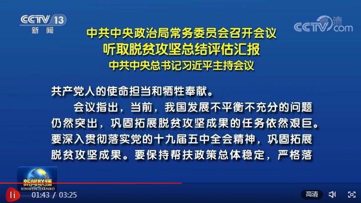 12月3日,中共中央政治局常務(wù)委員會(huì)召開(kāi)會(huì)議,聽(tīng)取脫貧攻堅(jiān)總結(jié)評(píng)估匯報(bào)。習(xí)近平總書(shū)記主持會(huì)議并發(fā)表重要講話。在講話中,總書(shū)記總結(jié)了黨的十八大以來(lái)脫貧攻堅(jiān)工作取得的成績(jī),肯定了各級(jí)黨委和政府以及社會(huì)協(xié)同發(fā)力、合力攻堅(jiān)的卓越付出。央視網(wǎng)《聯(lián)播+》特梳理講話及會(huì)議要點(diǎn),以饗讀者。