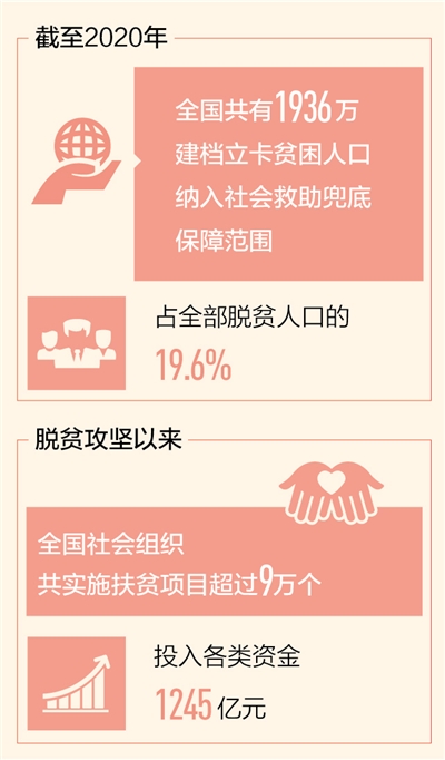 習(xí)近平總書記指出,民政工作關(guān)系民生、連著民心,是社會建設(shè)的兜底性、基礎(chǔ)性工作。決戰(zhàn)決勝脫貧攻堅,民政部門以完善制度機(jī)制、聚焦特殊群體、助力重點(diǎn)地區(qū)攻堅等政策“組合拳”,兜住最困難群體,保住最基本生活。數(shù)據(jù)顯示,截至2020年,全國共有1936萬建檔立卡貧困人口納入社會救助兜底保障范圍,占全部脫貧人口的19.6%,脫貧地區(qū)群眾獲得感、幸福感、安全感不斷提升。