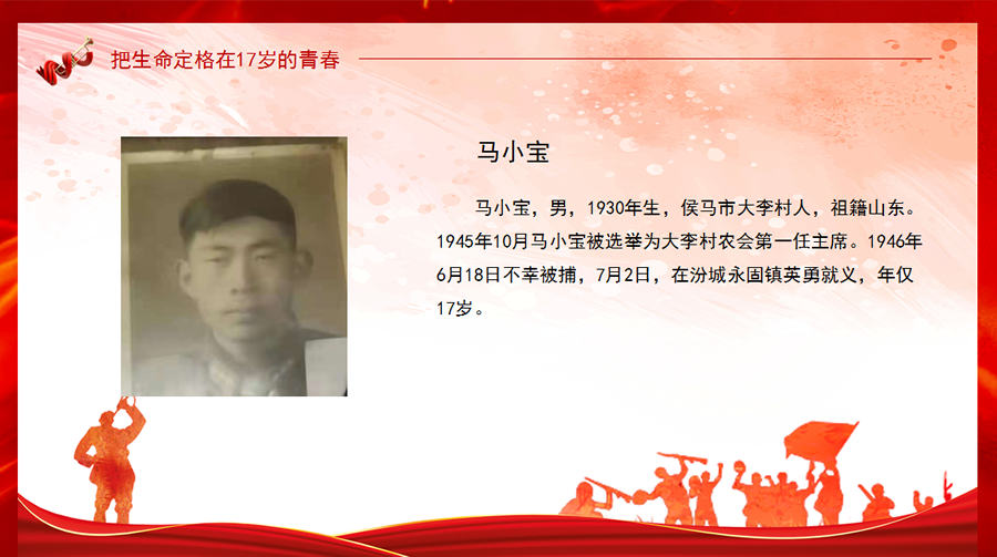 馬小寶,男,1930年生,侯馬市大李村人,祖籍山東。1945年10月馬小寶被選舉為大李村農(nóng)會第一任主席。1946年6月18日不幸被捕,7月2日,在汾城永固鎮(zhèn)英勇就義,年僅17歲。