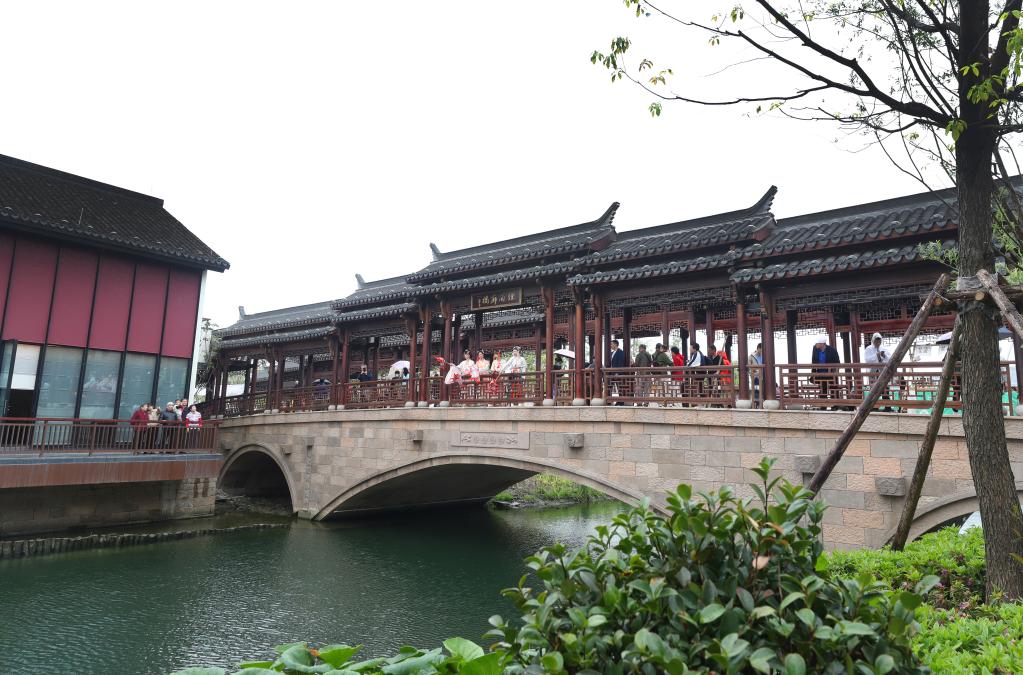 身著古裝的居民們?cè)隗待執(zhí)斓貎?nèi)的煙雨廊橋上表演。新華社記者方喆攝