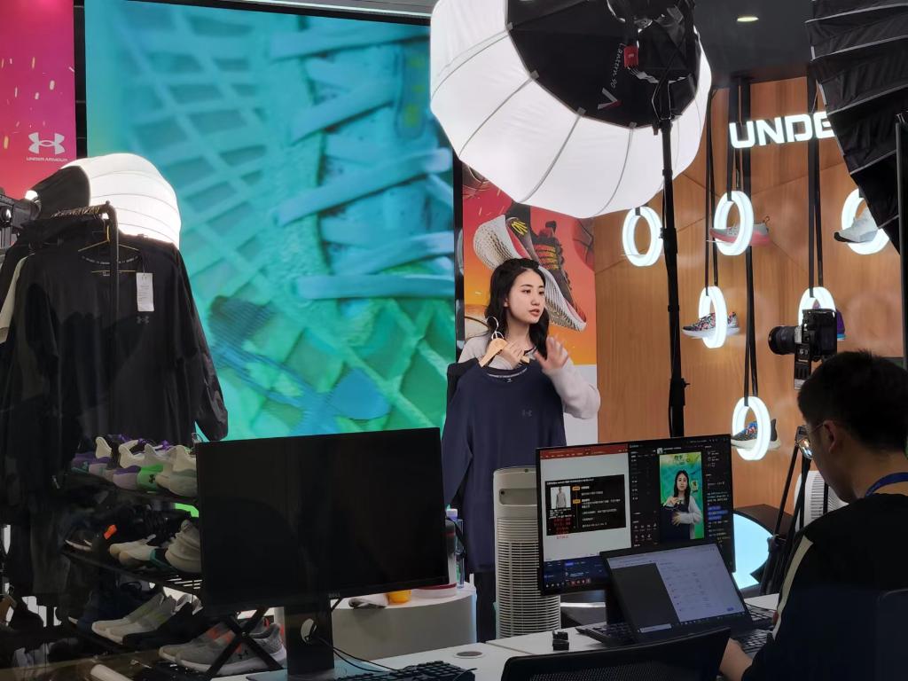 百秋公司直播中心里主播正在線上展示國(guó)際品牌服飾。新華社記者王默玲 攝