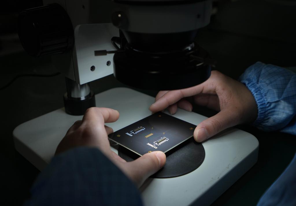 6月2日,工作人員在蘇州光電技術(shù)研究院的封裝測(cè)試公共服務(wù)平臺(tái)車(chē)間內(nèi)檢測(cè)一塊激光雷達(dá)芯片。新華社記者 李尕 攝