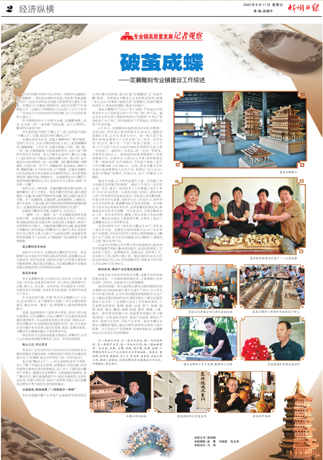 今年以來,定襄縣把雕刻專業(yè)鎮(zhèn)建設(shè)作為加快產(chǎn)業(yè)轉(zhuǎn)型升級(jí)、推進(jìn)市場(chǎng)主體倍增、發(fā)揮縣域特色優(yōu)勢(shì)、鍛造發(fā)展長(zhǎng)板的重要抓手,充分發(fā)揮本縣雕刻產(chǎn)業(yè)的基礎(chǔ)優(yōu)勢(shì)和資源稟賦,培龍頭、塑品牌、拓市場(chǎng)、建基地、育人才、擴(kuò)宣傳、送政策,以特色專業(yè)鎮(zhèn)建設(shè)為高質(zhì)量發(fā)展注入新動(dòng)能。