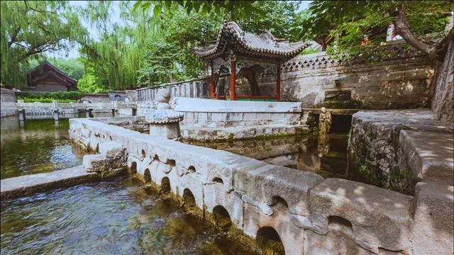 這首詩描寫的景致主要是“晉祠之水”。從詩中,我們可以發(fā)現(xiàn)晉祠之水有兩個(gè)特點(diǎn)。一是綠,因?yàn)樗袖仢M莎草,所以“晉祠之水如碧玉”。這景象如今前往晉祠還能看得見。二是水量充沛,能讓人“浮舟弄水”,而船上除了李白、元演,還有許多樂工歌伎,免不了還會有其他賓客,合理猜測,船定然不是一葉扁舟,起碼是游船不可。李白寫詩好夸張,形容晉祠之水為“百尺清潭”。然而他也說過“桃花潭水深千尺”,廬山瀑布“飛流直下三千尺”,說晉祠之水僅僅“百尺”,在李白詩中尚算保守。