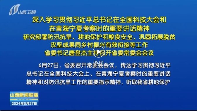 山西日?qǐng)?bào)報(bào)道6月27日,省委召開常委會(huì)會(huì)議,傳達(dá)學(xué)習(xí)貫徹習(xí)近平總書記在全國(guó)科技大會(huì)上、在青海寧夏考察時(shí)的重要講話精神和對(duì)防汛抗旱工作的重要指示精神,聽取我省耕地保護(hù)和糧食安全責(zé)任制工作落實(shí)、2023年度市縣黨委和政府鞏固拓展脫貧攻堅(jiān)成果同鄉(xiāng)村振興有效銜接考核情況匯報(bào),審議通過《山西省2023年度國(guó)家鞏固拓展脫貧攻堅(jiān)成果同鄉(xiāng)村振興有效銜接考核評(píng)估反饋問題整改工作方案》。省委書記唐登杰主持會(huì)議。