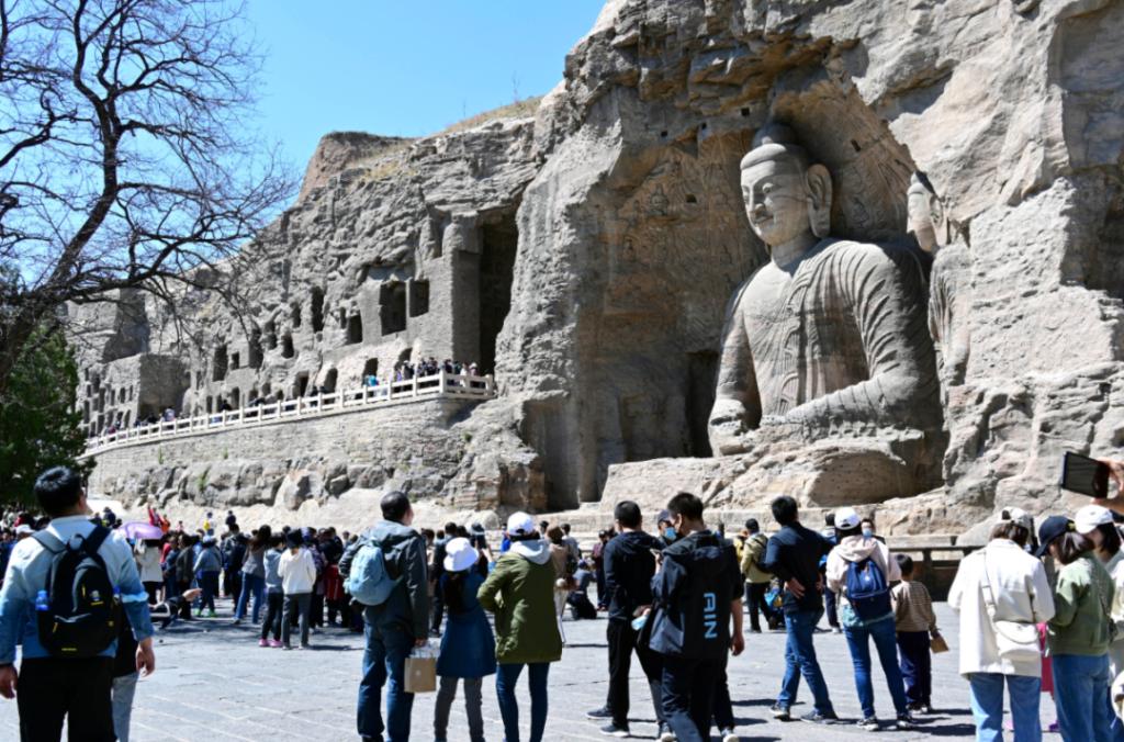 ▲2023年5月,游客在大同云岡石窟游覽。云岡石窟的開鑿始于北魏時(shí)期,為中國(guó)規(guī)模最大的古代石窟群之一,與敦煌莫高窟、洛陽(yáng)龍門石窟和天水麥積山石窟并稱為中國(guó)四大石窟藝術(shù)寶庫(kù)。山西日?qǐng)?bào)記者劉通攝