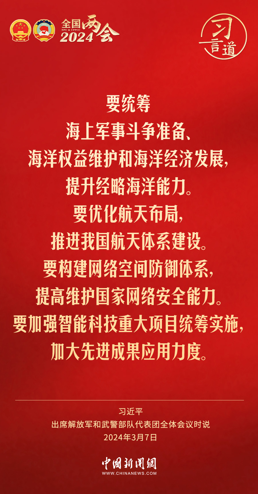 中共中央總書記、國家主席、中央軍委主席習近平7日下午出席十四屆全國人大二次會議解放軍和武警部隊代表團全體會議,習近平強調——