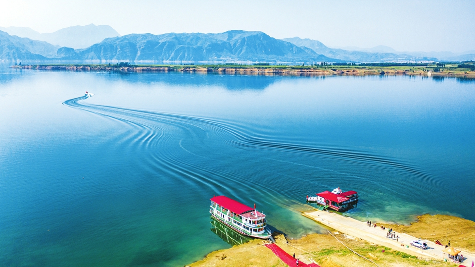 5月5日,在垣曲縣古城國家濕地公園內,游客或乘游輪、或乘快艇,游覽濕地如詩如畫美景,樂享假日。近年來,隨著當?shù)丶哟鬂竦亻_發(fā)與保護力度,黃河濕地生態(tài)環(huán)境得以明顯改善,生態(tài)文明建設成果更好地惠及人民。
