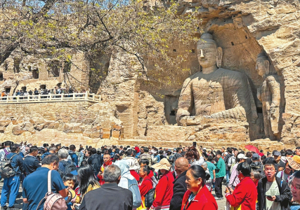 5月4日,游客在世界文化遺產云岡石窟游覽、參觀。