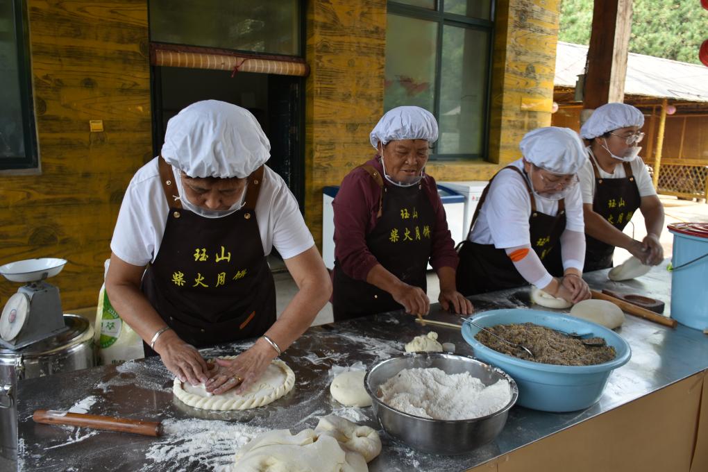 張小女制作的“大團圓”月餅體現(xiàn)了當?shù)靥厣芍荽衷嘛灴瓷先ハ褚粋€鎖著花邊的圓形面餅,內(nèi)包兩層冰糖、花生、葡萄干、核桃仁等雜碎餡料,表面裝飾圖案,或蒸或烤而成。講究的圖案比較復雜,但張小女喜歡在村口拔棵野草,洗干凈后,印在上面,充滿野趣。