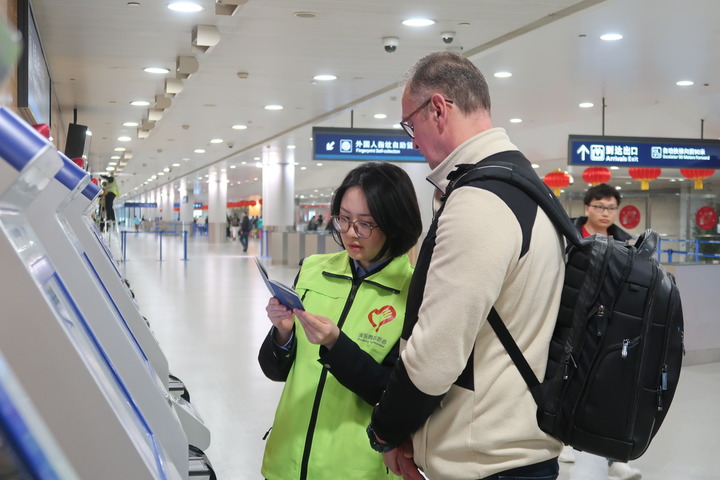 上海機場邊檢“百人外語志愿服務(wù)隊”民警正在協(xié)助外國旅客辦理入境手續(xù)。新華社記者唐斯琦 攝