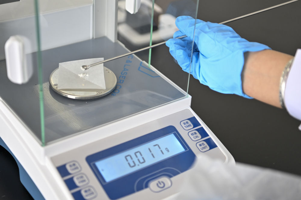 4月16日,在云岡研究院石質(zhì)文物保護(hù)研究室,工作人員張帆為石窟壁面樣本稱重。云岡石窟現(xiàn)存主要洞窟45個