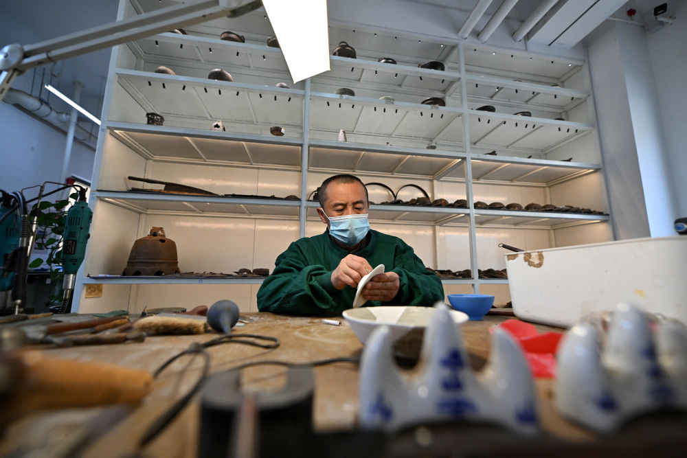 4月15日,在云岡研究院可移動文物修復(fù)室,工作人員劉銓義在進(jìn)行瓷器修復(fù)。