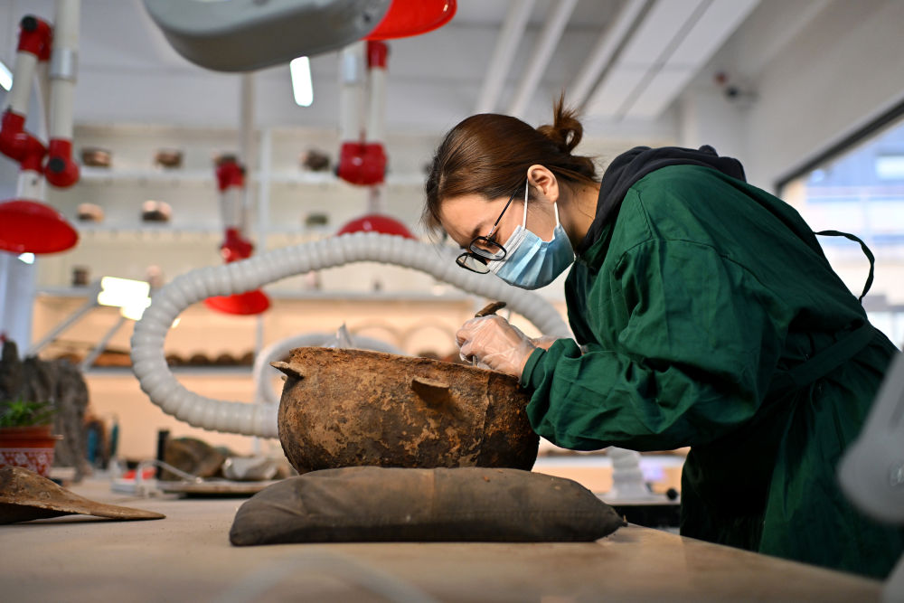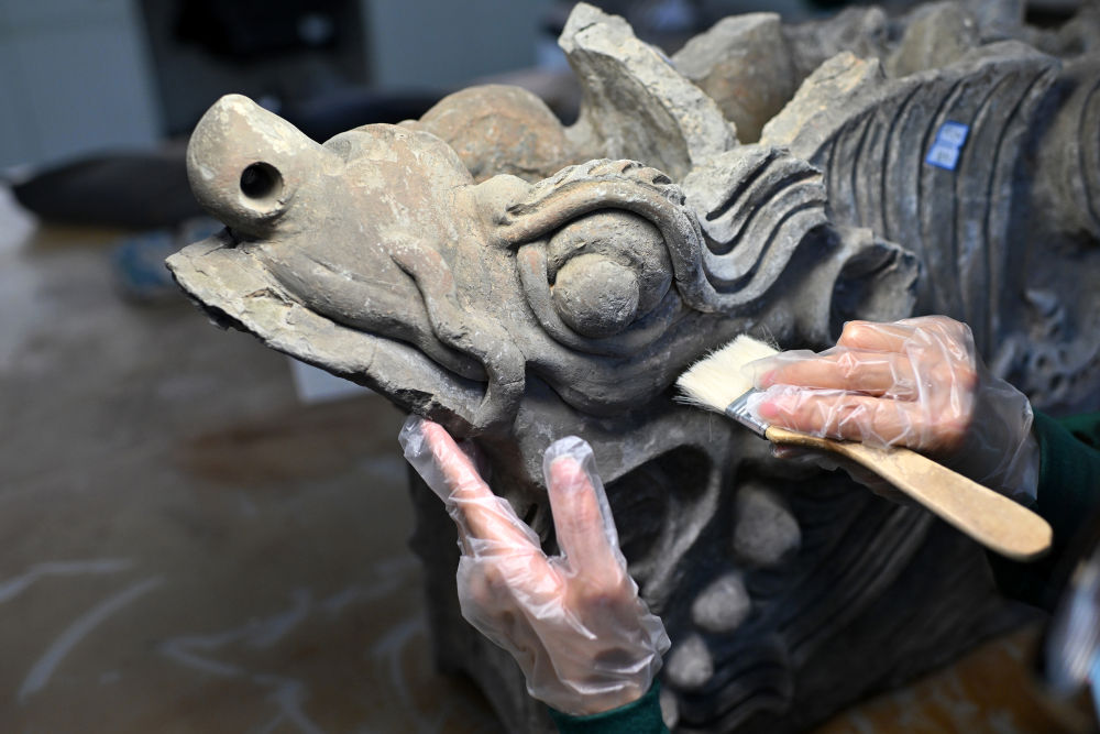 4月15日,在云岡研究院可移動文物修復(fù)室,工作人員在進(jìn)行除塵作業(yè)。