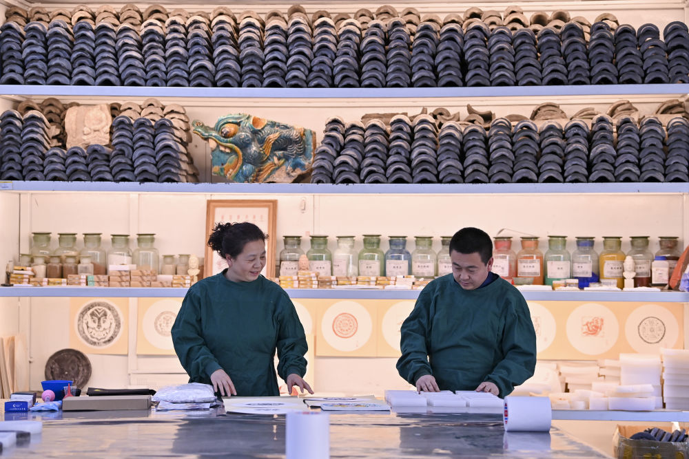 4月15日,在云岡研究院可移動文物修復(fù)室,工作人員安永芳(左)和魏松林為接下來的研學(xué)活動準(zhǔn)備相關(guān)用品。