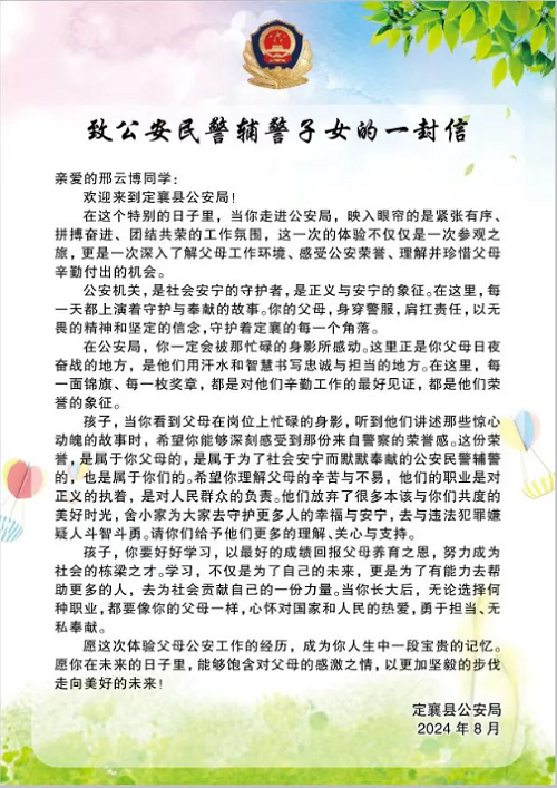 為進(jìn)一步增強(qiáng)中小學(xué)生反詐、禁毒、交通安全意識,通過小手拉大手等形式,大力學(xué)習(xí)、宣傳、弘揚(yáng)武霖同志英勇無畏、忠誠為民的高尚品質(zhì)。8月20日上午,定襄縣公安局精心策劃,組織開展了“警娃探警營”主題警營體驗(yàn)日活動(dòng),50余名民輔警子女和警爸警媽共同走進(jìn)警營,體驗(yàn)警察生活、感受警營文化。
