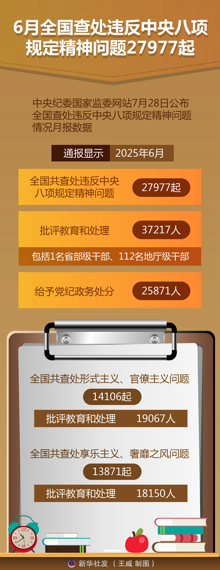 新華社北京7月28日電(記者孫少龍)中央紀(jì)委國家監(jiān)委網(wǎng)站28日公布全國查處違反中央八項(xiàng)規(guī)定精神問題情況月報(bào)數(shù)據(jù)。通報(bào)顯示,今年6月,全國共查處違反中央八項(xiàng)規(guī)定精神問題27977起,批評教育和處理37217人(包括1名省部級干部、112名地廳級干部),給予黨紀(jì)政務(wù)處分25871人。