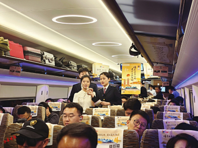 4月22日一早,在太原開往北京的書香列車上,山西晚報(bào)記者看到了這樣一幕。車廂內(nèi),兩側(cè)車窗、行李架、衛(wèi)生間、洗漱臺(tái)等處張貼全民閱讀大會(huì)標(biāo)識(shí),營(yíng)造了濃厚的活動(dòng)氛圍。列車視頻和廣播循環(huán)播放全民閱讀大會(huì)宣傳片,介紹大會(huì)概況及“書香列車”情況。幾名年輕乘客圍在列車餐吧臺(tái)增設(shè)的“讀書角”,選取自己喜歡的讀物。列車工作人員利用流動(dòng)小車,送書到車廂,為旅客提供圖書借閱服務(wù)。在車廂兩端、每個(gè)座位頭枕巾上張貼、印刷全民閱讀大會(huì)主題海報(bào)和“書香列車云閱讀”二維碼,不少旅客掃碼開始免費(fèi)聽(tīng)書、看書。