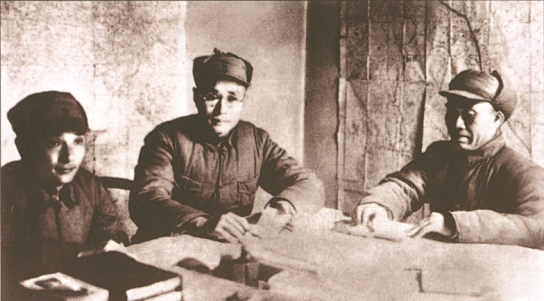 圖9 1937年12月,八路軍第一二九師開(kāi)辟以太行山為中心的晉冀豫抗日根據(jù)地。圖為朱德(右)與劉伯承(中)、鄧小平(左)在研究根據(jù)地建設(shè)。
