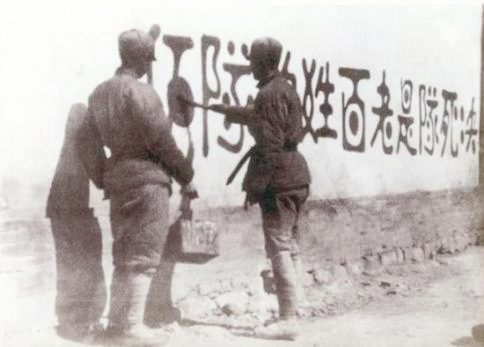 圖2 山西新軍既是戰(zhàn)斗隊(duì),又是工作隊(duì)。他們走到哪里,宣傳到哪里,動(dòng)員青年參軍;組織人民武裝自衛(wèi)隊(duì)、游擊隊(duì);協(xié)助地方建黨、建政,組建工、農(nóng)、青、婦等群眾團(tuán)體,創(chuàng)建抗日根據(jù)地。圖為1938年初,決死隊(duì)?wèi)?zhàn)士在沁縣書(shū)寫(xiě)宣傳標(biāo)語(yǔ)。