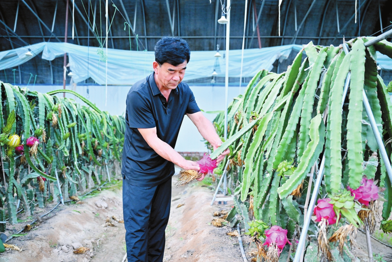 鄔瑞華正在觀察火龍果長(zhǎng)勢(shì)。本報(bào)記者馮曉磊攝 近日,河曲縣柏鹿泉村的7座日光溫室大棚,悄然成為當(dāng)?shù)嘏笥讶Φ摹熬W(wǎng)紅”打卡地。誰也想不到,在北方的黃土地上,竟結(jié)出了熱帶火龍果。 沿著黃河岸畔蜿蜒的山路前行,溝壑縱橫、梁峁交錯(cuò),坡地上的紅蔥田與遠(yuǎn)處奔騰的黃河相映如畫。轉(zhuǎn)過一道山峁,鄔瑞華的火龍果大棚躍入眼簾。 “能在年均氣溫只有8℃的晉西北種出火龍果,誰說不是奇跡?”現(xiàn)年59歲的莊稼漢鄔瑞華邊說邊利落地摘下一顆紫得發(fā)亮的果實(shí),粗糙的手掌輕撫果皮,語氣中充滿自豪。 大棚里濕潤(rùn)溫暖,火龍果枝條攀援而上,青蔓垂紅果,猶如南國(guó)果園。而在3年前,這里還是一片閑置的大棚,鄔瑞華的夢(mèng)想最初也只換來一片嘲笑——“北方種火龍果?異想天開!”“苗都活不了!”村里人的質(zhì)疑,像極了百年前“走西口”路上那呼嘯的風(fēng),凜冽又真實(shí)。 河曲,曾是山西人“走西口”路上最重要的渡口之一。一代代河曲人被迫告別貧瘠的土地,跨過黃河、走向口外,只為討一口飯吃。而今天,“鄔瑞華們”不再出走,他們要把“不可能”變成“可能”。 2023年,鄔瑞華拿出全部積蓄70多萬元,三下海南,拜師學(xué)藝。幾個(gè)筆記本密密麻麻記錄著火龍果種植的溫度、濕度、授粉、疏花等每一個(gè)細(xì)節(jié)?;貋頃r(shí),他不僅帶回了果苗,更帶回了技術(shù)與決心。 恒溫控制、山泉滴灌、果熟采摘……他像呵護(hù)嬰兒一般照料這些“南方來客”。最艱難時(shí),他睡在大棚旁的板房里,每?jī)尚r(shí)起來看一次溫度;灌溉設(shè)施改造時(shí),他帶著兒子徒手挖溝,血泡磨破又愈合,掌心結(jié)出一層厚繭。去年那場(chǎng)大雪壓塌棚頂,他冒雪搶修,手指凍得僵直,回家用燒酒搓了半宿才緩過來。 鄔瑞華屈指叩響一顆果實(shí),傳出沉悶熟透的聲音。他說:“一枝只留一果,甜度才夠?;瘕埞麑儆谙扇苏瓶浦参?,一次栽培,以后每年都會(huì)開花結(jié)果10至15次。” 首茬果熟時(shí),縣農(nóng)業(yè)農(nóng)村局專家檢測(cè)后連連稱贊“:果皮薄、糖度高,品質(zhì)上乘!”那一刻,鄔瑞華蹲在地上抹起了眼淚。他在朋友圈發(fā)了一張照片:晨露未干的火龍果堆成小山,配文——“北地亦有南國(guó)春”。這7個(gè)字,像是一聲春雷在黃土高原迅速炸響,游客、主播、代理商紛至沓來。偏關(guān)網(wǎng)紅“王會(huì)長(zhǎng)”現(xiàn)場(chǎng)直播:“家人們看啊,黃土高坡結(jié)火龍果,甜得很……”訂單提示音此起彼伏,昔日沉寂的山村一下子熱鬧起來。 如今,他的火龍果采摘價(jià)每斤10元,單棚年產(chǎn)量超2000斤,年收入穩(wěn)定在14萬元以上。品相稍次的果實(shí)被本地企業(yè)深加工為凍干產(chǎn)品,每斤賣到百元仍供不應(yīng)求“。除了主打的火龍果,大棚里還穿插種植了香蕉、無花果、小金桔、草莓,明年計(jì)劃再引進(jìn)一些新品種。我還要學(xué)習(xí)直播帶貨,給大家提供團(tuán)建、研學(xué)、露營(yíng)、燒烤、代種代養(yǎng)多種服務(wù)?!?/p> 更重要的是,他帶動(dòng)了一批鄉(xiāng)親走上“南果北種”之路。面對(duì)上門求教的人,鄔瑞華總是耐心傳授技藝。他手握粉筆認(rèn)真畫栽培圖的樣子,仿佛仍是當(dāng)年那個(gè)追著海南技術(shù)員提問的北方漢子。 從“走西口”到“留家鄉(xiāng)”,從“刨土坷垃”到“種金果子”,鄔瑞華用實(shí)際行動(dòng)詮釋了新時(shí)代河曲人的突圍與堅(jiān)守。他站在大棚前,身后是累累碩果,眼前是滾滾黃河。 (責(zé)任編輯:梁艷) |
